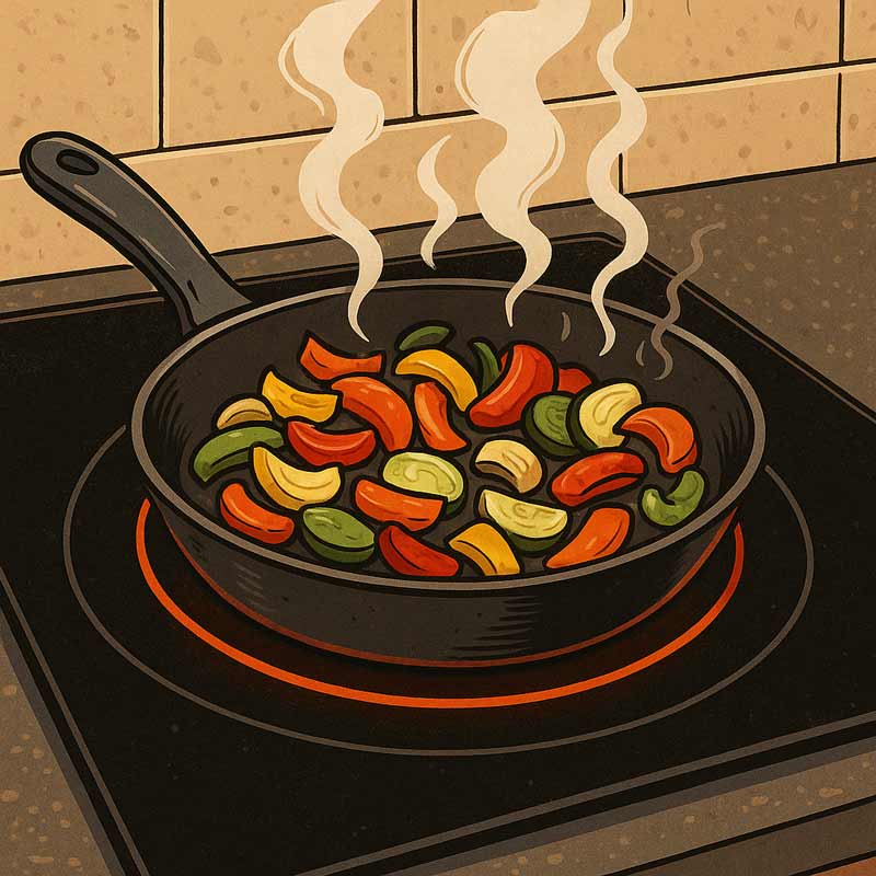 • 5-6 = vihannesten paistaminen, pastavesi kiehuu hitaasti